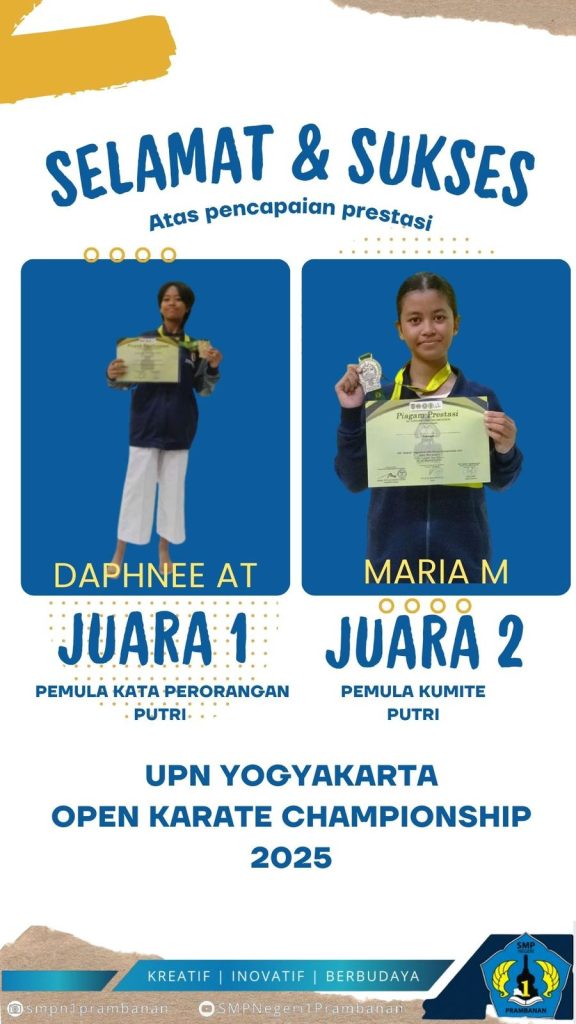 Selamat dan sukses kami ucapkan kepada Ananda Maria Magdalena Almeira, Daphnee Andamari Tierra, dan Rifat Pradipta Arsadinata Kelas 7A yang telah mengharumkan nama SMP Negeri 1 Prambanan. Semoga apa yang diraih hari ini menjadikan anak-anak menjadi lebih semangat lagi dalam mengembangkan dan meningkatakan potensi masing-masing. Ketiganya telah mengharumkan nama baik SMP Negeri 1 Prambanan dengan Juara 1 Pemula Kata Perorangan Putri UPN Yogyakarta Open Karate Championship 2025 yang diraih oleh Daphnee, Juara 2 Pemula Kumite Putri UPN Yogyakarta Open Karate Championship 2025 yang diraih oleh Maria serta Juara 1 Next Level Basketball League 2025 yang diraih oleh Rifat Pradipta.