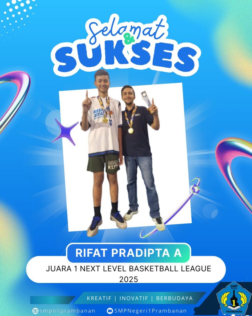 Selamat dan sukses kami ucapkan kepada Ananda Maria Magdalena Almeira, Daphnee Andamari Tierra, dan Rifat Pradipta Arsadinata Kelas 7A yang telah mengharumkan nama SMP Negeri 1 Prambanan. Semoga apa yang diraih hari ini menjadikan anak-anak menjadi lebih semangat lagi dalam mengembangkan dan meningkatakan potensi masing-masing. Ketiganya telah mengharumkan nama baik SMP Negeri 1 Prambanan dengan Juara 1 Pemula Kata Perorangan Putri UPN Yogyakarta Open Karate Championship 2025 yang diraih oleh Daphnee, Juara 2 Pemula Kumite Putri UPN Yogyakarta Open Karate Championship 2025 yang diraih oleh Maria serta Juara 1 Next Level Basketball League 2025 yang diraih oleh Rifat Pradipta.